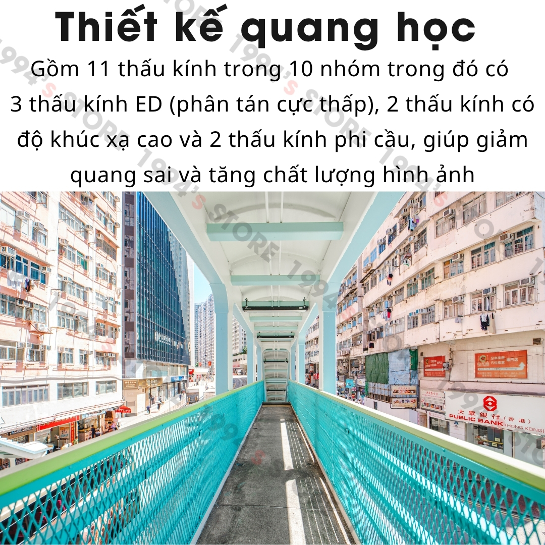 🔵 Gồm 11 thấu kính trong 10 nhóm trong đó có 3 thấu kính ED (phân tán cực thấp), 2 thấu kính có độ khúc xạ cao và 2 thấu kính phi cầu, giúp giảm quang sai và tăng chất lượng hình ảnh