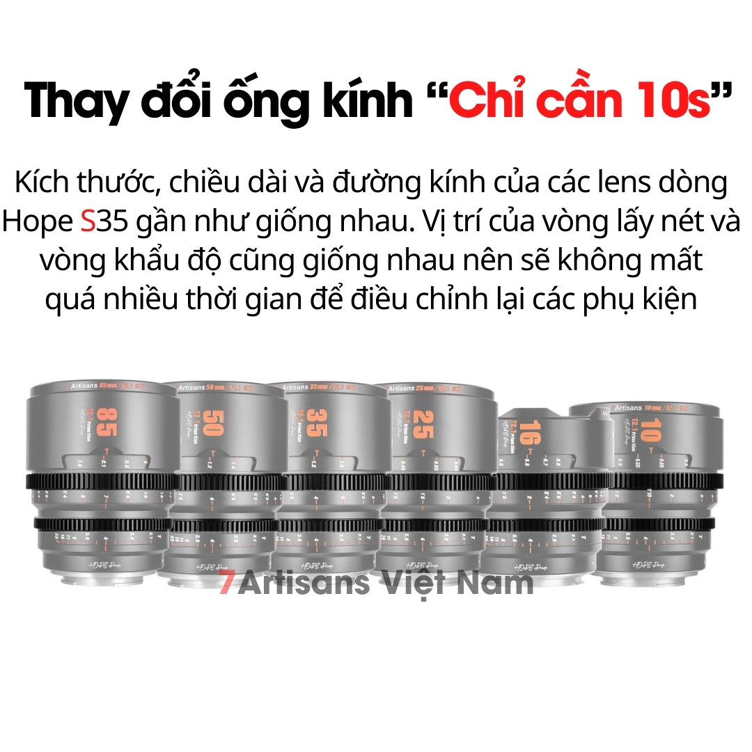 Bộ 6 lens 7Artisans Hope Cine Lens S35 – Ống kính chuyên quay phim 10mm, 16mm, 25mm, 35mm, 50mm và 85mm T2.1 Super35