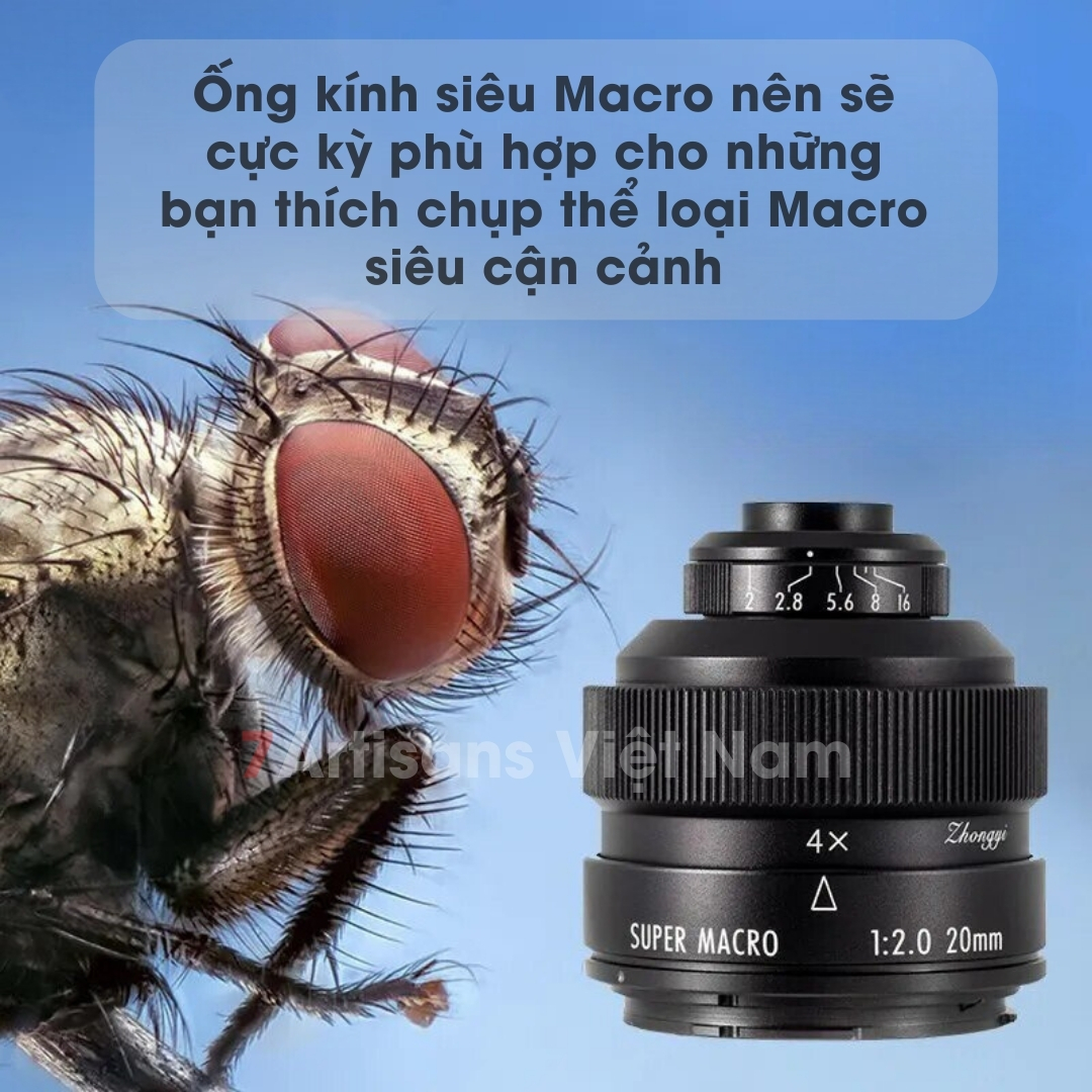 🔥 Mitakon 20mm F2.0 4.5X là ống kính super macro lấy nét tay cho máy Full Frame, có độ phóng đại hình ảnh rất lớn, lên đến 4.5:1. Điều này có nghĩa là bạn có thể lấp đầy ảnh của bạn bằng một vật thể có kích thước nhỏ hơn 4.5 lần so với kích thước cảm biến. Với khẩu độ lớn F2 và nhỏ nhất F16, giúp chụp trong điều điện thiếu sáng tốt hơn. Bên trong ống kính là màng khẩu cấu thành từ 3 lá khẩu, có 6 thấu kính. Tất cả gói gọn là trong một ống kính nhỏ gọn với tổng chiều dài chỉ 6cm. Trong khi đó, để có được hệ số phóng đại lớn, theo cách thông thường, bạn sẽ phải dùng các ống nối dài rất cồng kềnh. Lưu ý là ống kính này được thiết kế chỉ để chụp Macro, không thể lấy nét ở vô cực được nó không đóng vai trò là ống kính đa dụng như các ống macro khác.