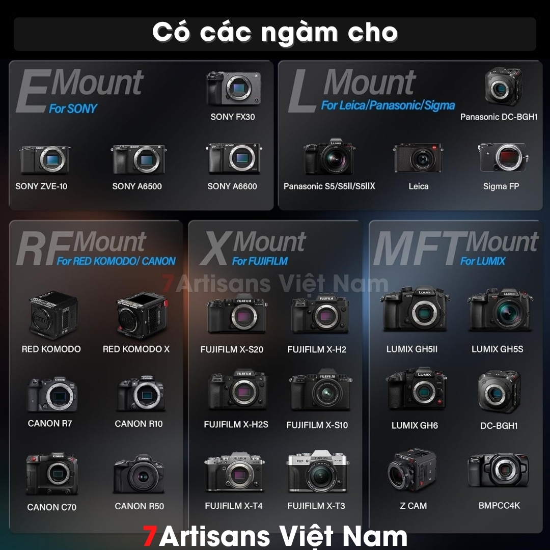 | Ngàm | Fujifilm X, Leica L, Sony E, Canon RF, M4/3 |