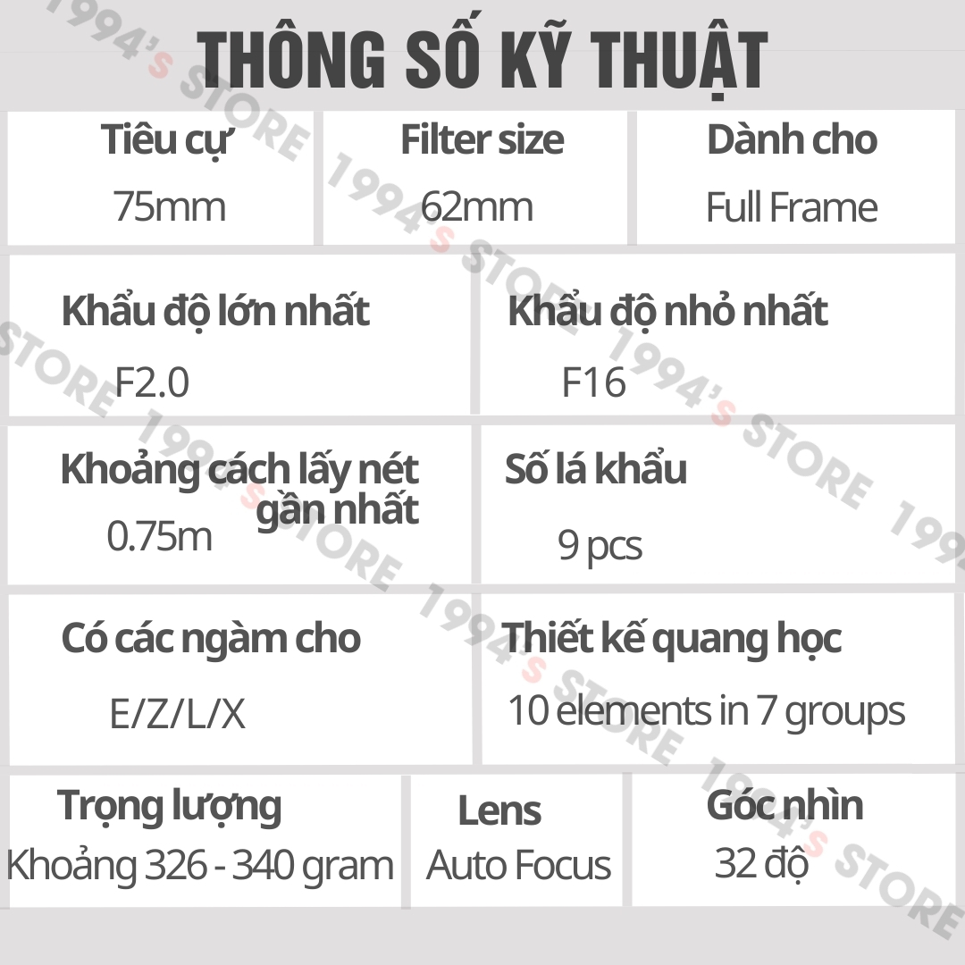 - Khoảng cách lấy nét gần nhất: 0.75m