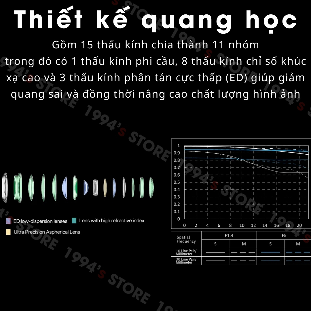 - Thiết kế quang học: 15 element in 11 groups