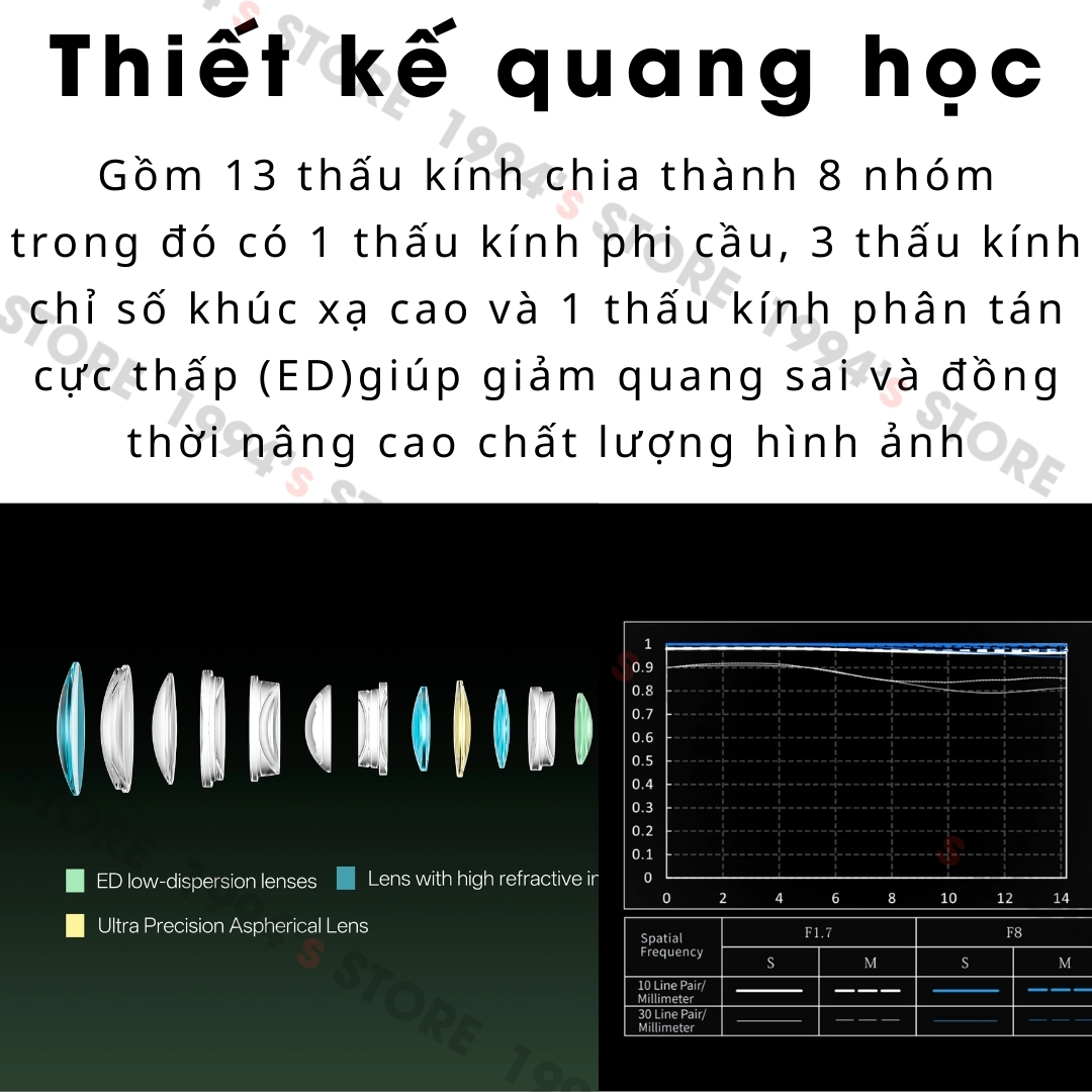 🔵 Thiết kế quang học: Gồm 13 thấu kính chia thành 8 nhóm trong đó có 3 thấu kính chiết suất cao, 1 thấu kính phi cầu và 1 thấu kính phân tán cực thấp (ED)giúp giảm quang sai và đồng thời nâng cao chất lượng hình ảnh
