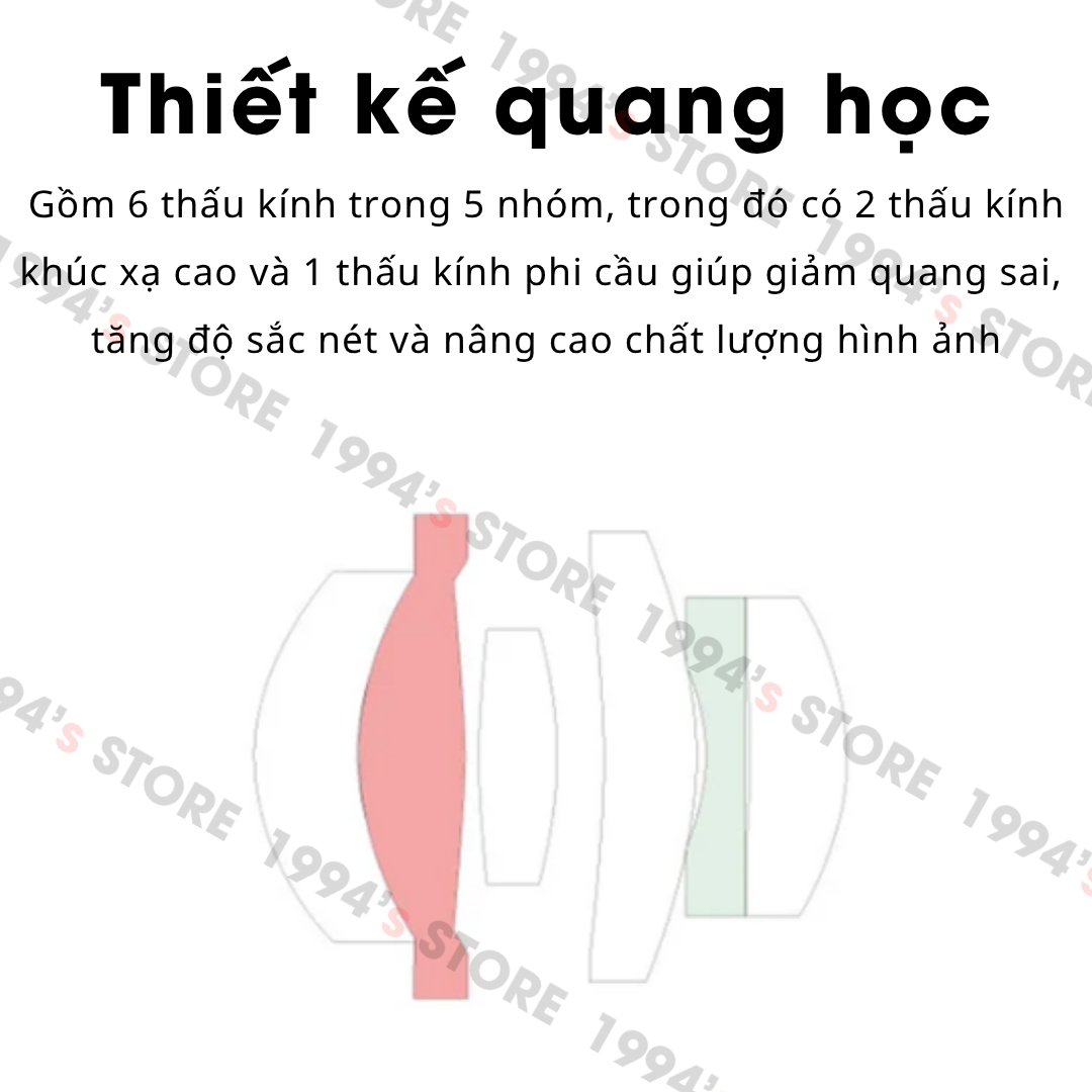🔵 Thiết kế quang học: Gồm 6 thấu kính trong 5 nhóm, trong đó có 2 thấu kính khúc xạ cao và 1 thấu kính phi cầu giúp giảm quang sai, tăng độ sắc nét và nâng cao chất lượng hình ảnh
