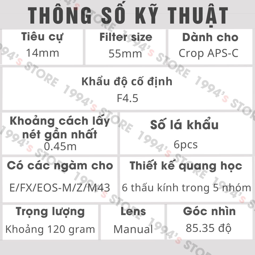 - Tiêu cự: 14mm