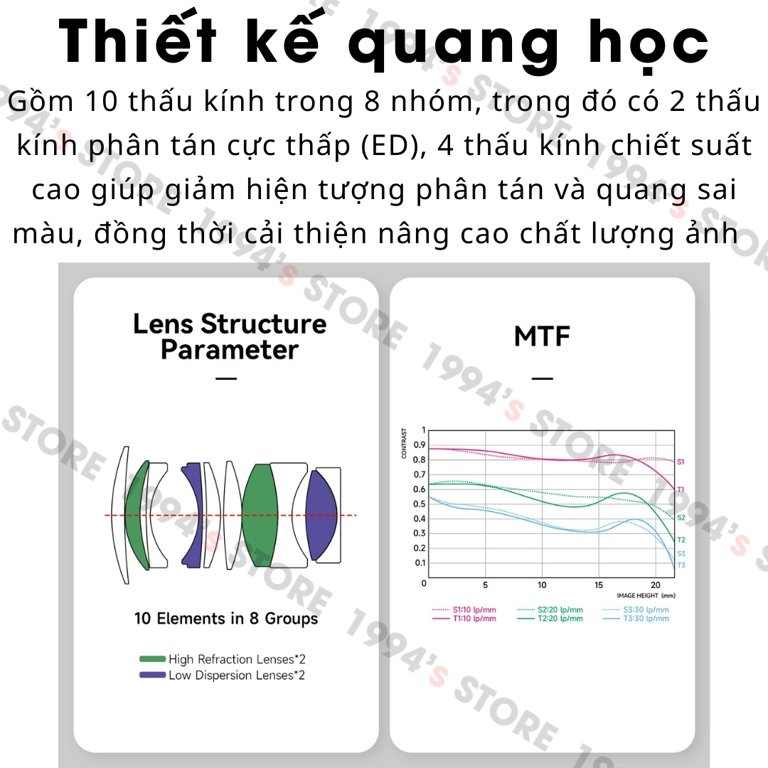 🔵 Gồm 10 thấu kính trong 8 nhóm, trong đó có 2 thấu kính phân tán cực thấp (ED), 4 thấu kính chiết suất cao giúp giảm hiện tượng phân tán và quang sai màu, đồng thời cải thiện nâng cao chất lượng ảnh