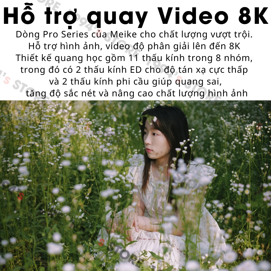 🔵 Hỗ trợ quay Video 8K: Dòng Pro Series của Meike cho chất lượng vượt trội.Hỗ trợ hình ảnh, video độ phân giải lên đến 8K. Thiết kế quang học gồm 11 thấu kính trong 8 nhóm, trong đó có 2 thấu kính ED cho độ tán xạ cực thấp và 2 thấu kính phi cầu giúp quang sai, tăng độ sắc nét và nâng cao chất lượng hình ảnh