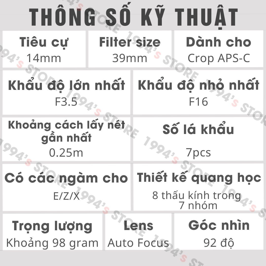 | Tiêu cự | 14mm |